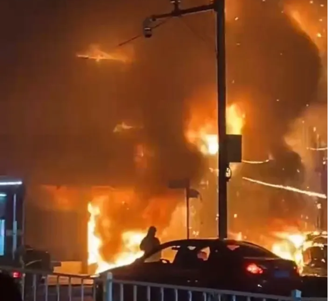 事故現場火勢猛烈,伴有大量濃煙,不僅殃及餐廳本身,還導致樓下一輛車被燒毀,并波及鄰近兩家店鋪。