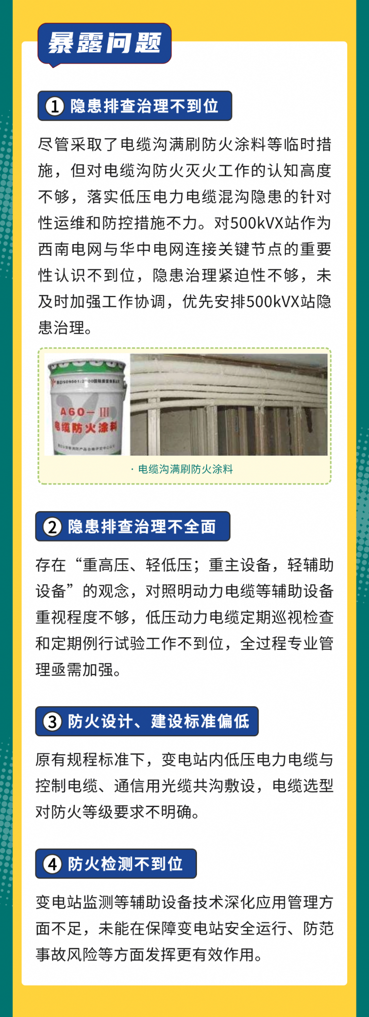 2019 年 5 月 6 日,某公司 500kV 一變電站,因站內照明箱低壓電纜故障著火,引燃同溝布置的控制電纜,造成母線失靈保護接點導通,500kV Ⅰ、Ⅱ 母線跳閘停運。