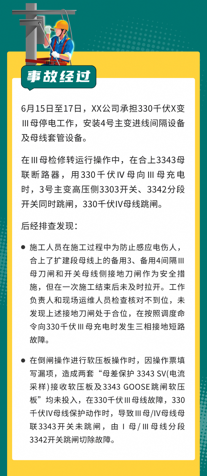 2018 年 6 月 16 日,某公司在 330kV 一變 330kV Ⅳ 母向 Ⅲ 母充電時,因送變電公司備用間隔開關母線側接地刀閘未拉開,漏項操作,造成 330kV Ⅲ、Ⅳ 母線跳閘。