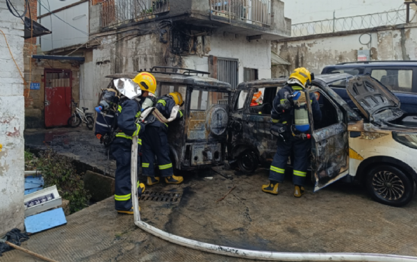 為避免火勢進一步蔓延,消防員立即使用水槍展開撲救,經(jīng)過處置,火勢被成功撲滅,但兩輛車均被燒毀。